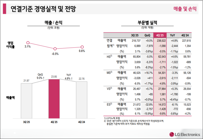 이에 LG전자는 실적 설명 과정에서 수익성 저하 배경으로 여러 요인을 함께 언급했다. 먼저 “가전과 전장 사업이 각각 관세 부담과 전기차 캐즘 등 비우호적 환경 속에서도 성장해 전사 매출 확대에 기여했지만 디스플레이 기반 제품 수요 회복 지연과 경쟁 심화로 마케팅비 투입이 늘었다”며 “여기에 하반기 전사 희망퇴직에 따른 수천억원 규모의 비경상 비용이 발생하며 영업이익이 감소했다”고 설명했다.