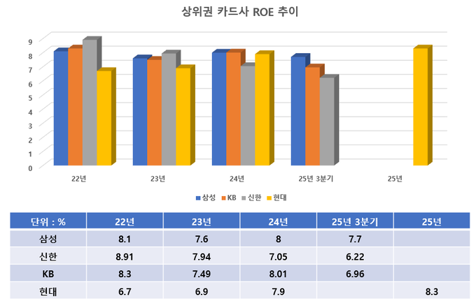 현대카드는 삼성·KB국민·신한카드 등 상위권 카드사 대비 ROE 수준이 낮아 상대적으로 비교 우위를 내세우기 어려웠다. 그러나 2024년 이후 ROE가 7% 후반대로 올라선 데 이어 2025년에는 8%대를 기록하며 수익성과 자본 효율 측면에서 존재감을 키웠다.