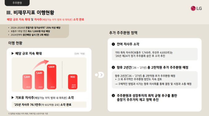 LG전자는 반도체 호황의 직접 수혜 기업은 아니다. 가전과 B2B 중심의 안정적인 현금흐름은 확보했지만 수익 변동성과 경쟁 심화에 따른 투자 부담을 동시에 관리해야 하는 상황이다. 이로 인해 환원 규모와 수단에서 보다 신중한 접근을 택했다는 해석이 나온다.