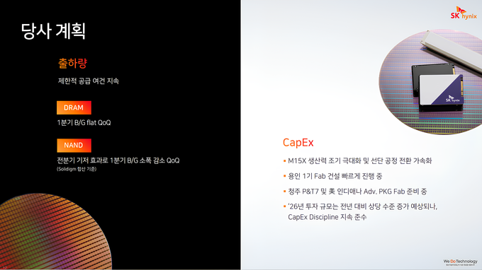 이어 김우현 SK하이닉스 CFO는 “용인 1기 팹과 미국 패키징 공장 등 미래 인프라 구축을 위해 2026년 CAPEX는 전년 대비 상당 수준 증가할 것”이라며 “매출 대비 30% 중반 수준의 투자 규율을 유지할 것”이라 밝혔다. 이는 투자 대상과 방향성을 언급하고 대략적인 투자 재원을 공개하는 등 시장 신뢰 제고를 위한 전략적 판단으로 풀이된다.