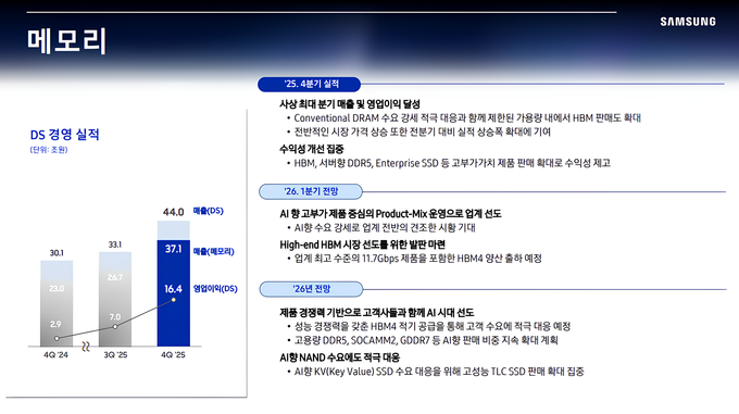 이러한 최대 실적 달성의 핵심은 AI 서버, 일반 서버 등 확산에 따른 HBM과 고성능 서버 D램 수요 증가다. 현재 AI 시장의 경우 모델 학습 중심 구조에서 실제 서비스 구현을 위한 구조로 빠르게 전환되고 있다. 이에 AI 관련 서버 시장의 고사양화가 가속화되고 있어 HBM 뿐만 아니라 서버용 DDR5, 엔터프라이즈 SSD 등 수요까지 동반 증가하는 흐름이다.
