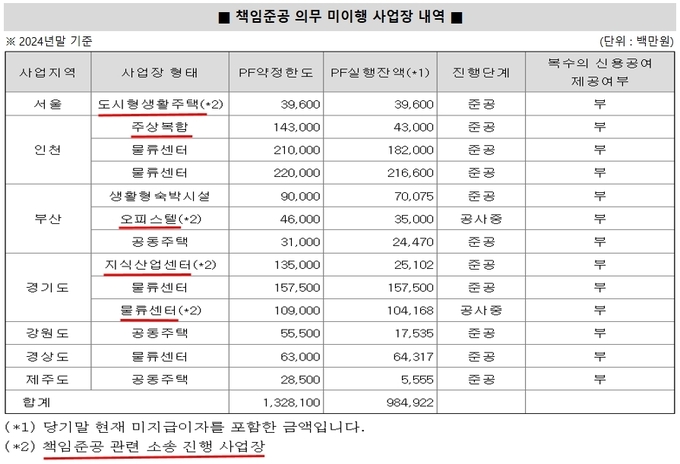 KB부동산신탁이 공시한 ‘책임준공 의무 미이행 사업장 내역’에 따르면 2024년 말 기준 책임준공 문제가 발생한 사업장은 총 13곳이다. 이들 사업장의 PF 약정 한도는 총 1조3281억원, 대출 실행액은 9849억원에 달한다. 이 중 5곳이 소송 진행 사업장이다.