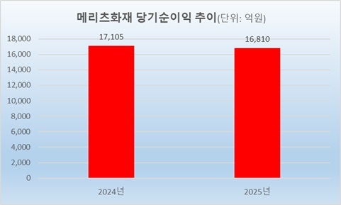 6일 메리츠화재가 공시한 개별 재무제표 기준 2025년 당기순이익은 1조6810억원으로 전년 1조7105억원에 비해 295억원(1.7%) 감소했다.