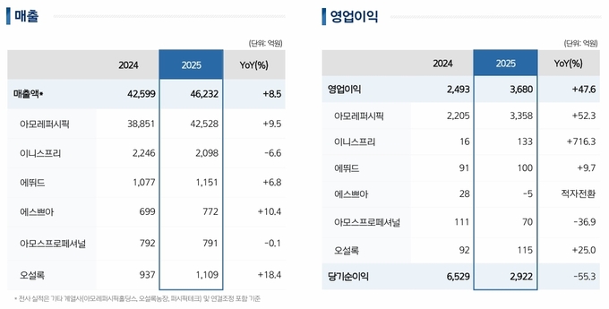 [FETV=김선호 기자] 아모레퍼시픽 그룹은 2025년 연결 기준 매출액 4조 6,232억 원, 영업이익 3,680억 원을 달성했다. 영업이익은 2019년 이후 6년 만의 최대 실적이다. 글로벌 프리미엄 스킨케어 브랜드 경쟁력 강화와 더마·메이크업·헤어 카테고리 호실적, 해외 주요 시장 확장이 실적 개선을 견인했다. 중장기 기업 비전 ‘Create New Beauty’ 실행이 본격화되며 글로벌 뷰티&웰니스 기업으로의 도약 기반을 한층 강화했다.