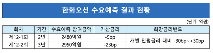[FETV=손영은 기자] 한화오션이 A- 등급으로 상향 후 첫 발행한 공모채 수요예측이 흥행했다. 긍정적 수요예측 결과에 따라 발행금액은 2600억으로 증액했다. 이자율도 A- 등급민평 대비 낮은 수치로 책정될 전망이다.