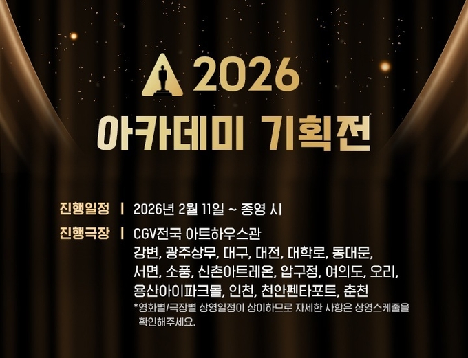 ‘2026 아카데미 기획전’은 CGV강변, 광주상무, 대구, 대전, 대학로, 동대문, 서면, 소풍, 신촌아트레온, 압구정, 여의도, 오리, 용산아이파크몰, 인천, 천안펜타포트, 춘천 등 전국 16개 극장에서 선보일 예정이다.