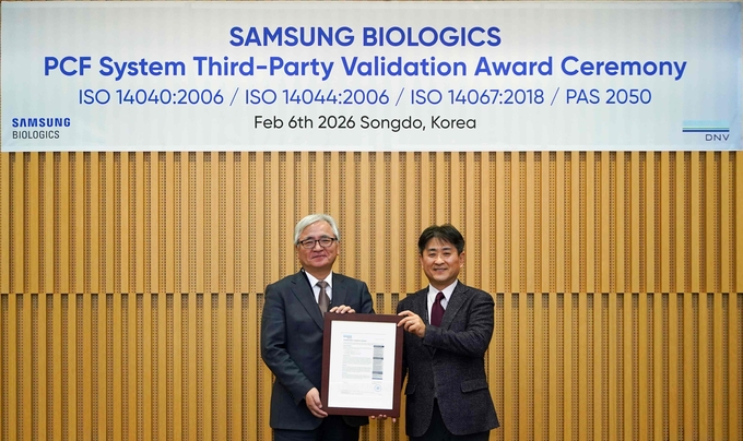 지난 6일 삼성바이오로직스는 인천 송도국제도시 소재 본사에서 PCF 시스템 제3자 검증서 수여식을 진행했다. 이번 검증은 노르웨이 소재 글로벌 인증기관 DNV(Det Norske Veritas)가 수행했다. DNV는 에너지, 제조, 바이오, 해양 등 다양한 산업 분야에서 국제 표준에 기반한 품질·환경·안전 관련 검증 및 인증 서비스를 제공하는 기관이다. 수여식에는 유승호 삼성바이오로직스 경영지원센터장(부사장), 이장섭 DNV 코리아 대표이사 등이 참석했다.