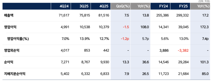 [FETV=심수진 기자] HD한국조선해양이 9일 실적 공시를 통해 2025년 연결기준 매출 29조9332억원, 영업이익 3조9045억원을 기록했다고 밝혔다. 고부가가치 선박의 인도 확대와 생산성 개선에 힘입어 매출은 전년 대비 17.2%, 영업이익은 172.3% 증가했다.