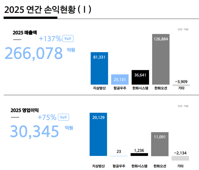 해당 실적은 지상방산 부문과 항공우주 부문의 꾸준한 성장, 한화오션의 연간 전체 연결 편입 등을 반영한 결과로 풀이된다.