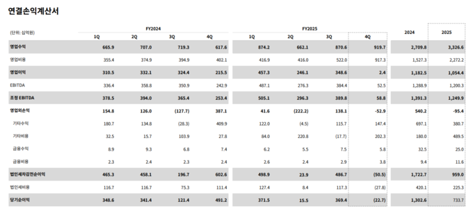 4분기 연결 매출은 9197억원을 기록했다. 다만 영업이익은 성수 신사옥 이전을 대비해 공동근로복지기금 816억원을 출연하는 등 일회성 비용이 반영되며 24억원에 그쳤다.