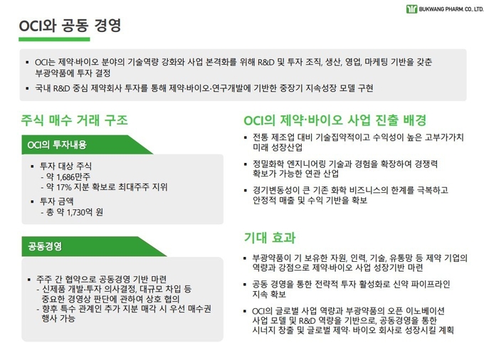 이번 인수는 부광약품의 사업 확장뿐 아니라 대주주인 OCI홀딩스의 지주사 요건 해소와도 관련이 깊다. 공정거래법상 지주회사는 상장 자회사 지분을 30% 이상 확보해야 하는데, 현재 17.11%를 보유한 OCI홀딩스는 유예 기간을 연장받았음에도 추가 지분을 확보해야 하는 상황이다. 이러한 배경에서 유니온제약 인수를 통한 기업 가치 높이기는 OCI그룹의 제약·바이오 사업 체계를 안정화하기 위한 선택으로 풀이된다.