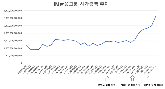 시가총액은 가파른 상승세를 이어가며 2조원 돌파 이후 1년도 채 되지 않아 3조원을 넘어섰다. 2026년 2월11일 기준 iM금융의 시가총액은 약 3조1000억원으로 집계됐다. 이는 지난 6일 실적을 발표한 지 불과 5일 만에 나타난 변화다.