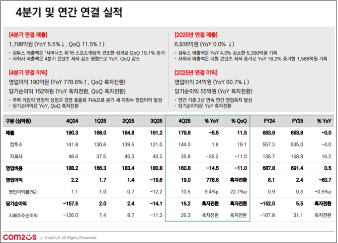 [FETV=이신형 기자] 컴투스가 12일 실적 공시를 통해 2025년 4분기 연결 기준 매출 1798억원, 영업이익 190억원을 기록하며 전년 동기 대비 영업이익이 779% 증가했다고 밝혔다.