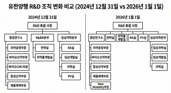 유한양행 관계자는 “1월 기준의 조직도는 기존 임원 퇴사에 따른 일시적 현상으로 현재 김열홍 사장 직속으로 업무 연속성을 유지하고 있다”며 “이번 계기로 R&D 효율성을 극대화하고 핵심 파이프라인에 자원을 집중하는 전략적 최적화를 추진할 계획”이라고 밝혔다.
