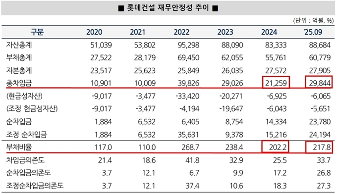 롯데건설도 안심할 상황은 아니다. 2024년과 2025년 3분기 매출원가율은 각각 93.5%, 93.6%로 높은 수준을 유지하고 있다. 일부 지방 사업장의 미분양 지속과 공사원가 상승, 공기 지연 등이 수익성을 압박하고 있다. 주택사업 운전자금 부담으로 차입금은 증가해 2025년 9월 말 기준 총차입금은 약 3조원, 부채비율은 217.8%를 기록했다.