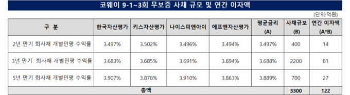 회차별 발행 규모는 제9-1회(2년물) 400억원, 제9-2회(3년물) 2200억원, 제9-3회(5년물) 700억원이다. 제9-1회는 2028년 3월 5일 만기로 원금은 만기일에 일시 상환될 예정이다. 이자는 발행일로부터 원금 상환기일까지 계산해 매 3개월마다 후급될 예정이며 최초 이자지급일은 2026년 6월 5일이다.