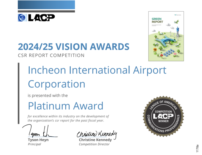 이번에 대상을 수상한 ‘2025 그린 리포트’는 지난해 10월에 발간되었으며 신재생에너지 확대, 지속가능항공유 확산을 위한 인센티브 시행, 수소 및 전기차 충전 인프라 확대를 통한 그린 모빌리티 생태계 구축 등 세계 최고 수준의 저탄소․친환경 공항 운영성과를 담았다.