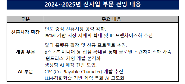 2024~2025년 경영참고사항에서 크래프톤의 신사업 축은 ‘배틀그라운드 IP 강화·다각화’와 ‘AI 고도화’였다. 크래프톤은 웹툰·단편영화 등 미디어 확장과 멀티 프로덕트 전략을 통해 배틀그라운드 IP를 프랜차이즈화하겠다는 구상을 밝혀왔다. 실제로 2021년 당시 크래프톤은 배틀그라운드의 탄생 비화를 담은 다큐멘터리 ‘미스터리 언노운’과 배우 마동석 주연의 단편 영화 ‘그라운드 제로’를 공개했었다.