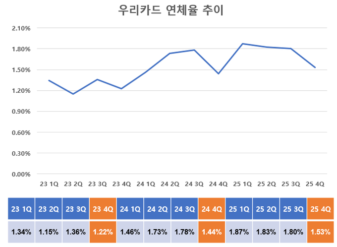 우리금융 팩트북에 따르면 우리카드의 연체율은 1분기 1.87%에서 3분기 1.80%로 완만히 낮아졌고 4분기에는 1.53%까지 하락했다. 연체율 하락에는 총대출 증가에 따른 분모 확대 효과도 일부 작용했지만 연체대출 규모 역시 감소하며 질적 개선이 병행된 것으로 나타났다. 총 대출은 1분기 14조9354억원에서 4분기 16조4910억원으로 늘어난 반면 연체대출은 2783억원에서 2520억원으로 줄었다.