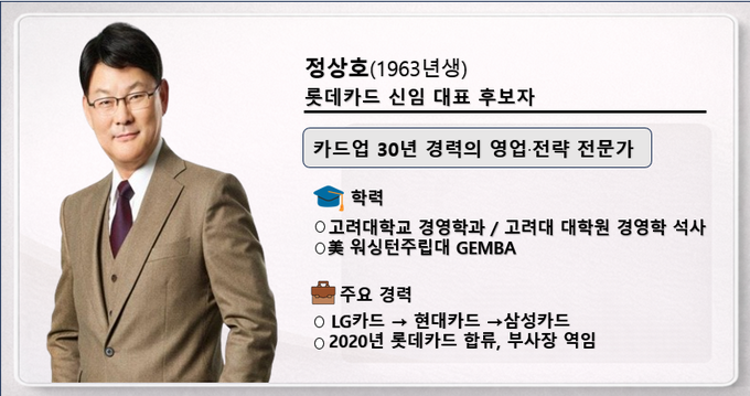 롯데카드 관계자는 "롯데카드 재직 경험으로 회사 내부 사정에 밝아 조직을 안정적으로 이끌 수 있는 리더십을 갖추고 있고 급변하는 환경에 대응해 대내외 신뢰 회복과 성장을 이끌어 갈 적임자"라고 말했다.