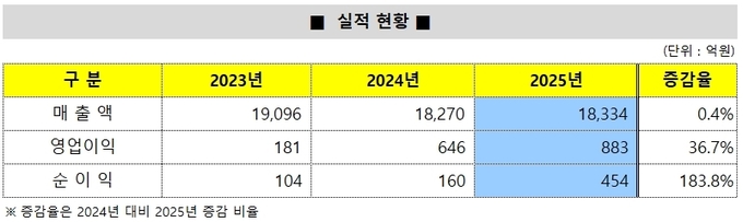금융감독원 전자공시시스템에 따르면 KCC건설의 2025년 별도 기준 매출은 1조8334억원으로 전년(1조8270억원) 대비 0.4% 증가했다. 사실상 외형은 제자리걸음이었지만 영업이익은 883억원으로 36.7% 늘었고 당기순이익은 454억원으로 183.8% 급증했다.