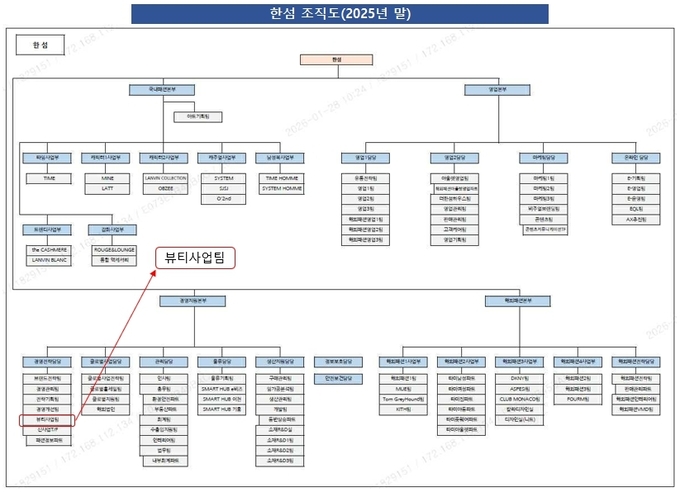 최근 한섬이 공시한 2026년 정기 주주총회 소집공고에 따르면 지난해 흡수합병한 한섬라이프앤을 경영전략담당 산하 ‘뷰티사업팀’으로 위치시켰다. 조직도로 보면 대표-경영지원본부-경영전략담당-뷰티사업팀으로 이어지는 구조다.