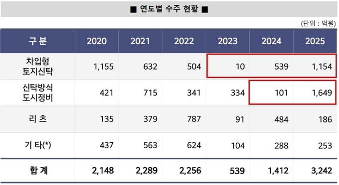 2025년 한국토지신탁의 연간 총수주액은 3242억원으로 집계됐다. 전년 대비 1830억원 증가하며 두 배를 웃도는 수준으로 확대됐다.