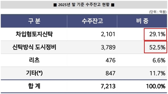 2025년 말 기준 총수주잔고는 7213억원이다. 이 가운데 신탁방식 도시정비가 3789억원(52.5%)으로 가장 큰 비중을 차지했고 차입형 토지신탁은 2101억원(29.1%)으로 2000억원을 돌파했다. 그밖에 리츠와 기타 부문이 각각 476억원(6.6%), 847억원(11.7%)을 기록했다.