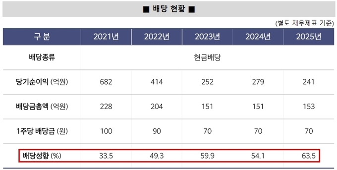 주주환원 기조는 비교적 일관되게 유지돼왔다. 최근 3개년 평균 배당수익률은 6%대를 기록했고 최근 5개년 별도 기준 평균 50% 이상 현금배당을 실시했다.