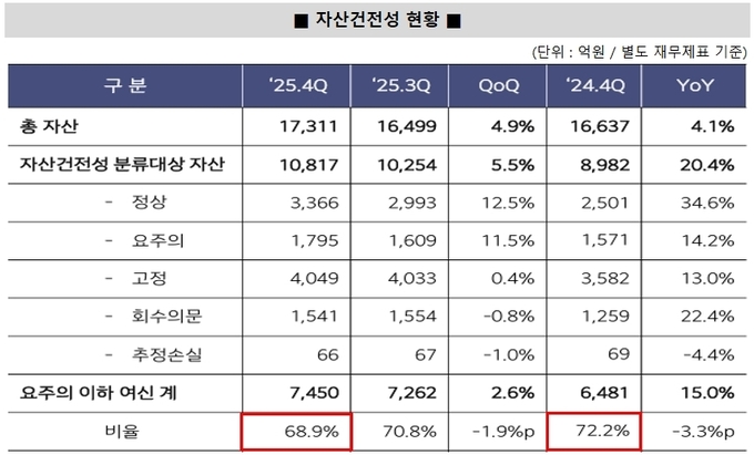 2025년 4분기 기준 자산건전성 분류대상 자산은 1조817억원으로 전년 동기 대비 20.4% 증가했다. 다만 요주의 이하 자산 비율은 68.9%로 전년(72.2%) 대비 3.3%p 개선됐다. 비율 측면에서는 건전성 관리가 강화된 모습이다.