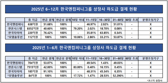 지급 속도의 경우 계열사별로 차이가 극명하게 갈렸다. 한온시스템은 10일 이내 단기 지급 비중이 79.2%로 가장 높았다. 과거 발생했던 60일 초과 지급은 지난해 하반기와 상반기 모두 발생하지 않았다.