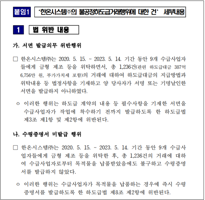이번 점검에서 특히 주목되는 부분은 지난 2일 공개된 한온시스템에 대한 공정위 제재다. 공정거래위원회에 따르면 한온시스템은 지난 2020년 5월부터 2023년 5월까지 9개 수급사업자에게 자동차 공조시스템 관련 금형 제조를 위탁하며 일부에 대해 서면을 아예 발급하지 않거나 서명·날인을 누락하는 등 서면 발급의무를 위반했다. 또 공정거래위원회는 8개 수급사업자에게 목적물 수령일을 초과해 대금을 지급하면서 지연이자를 지급하지 않았다고 설명했다.