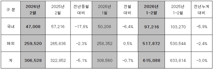 [FETV=이신형 기자] 현대자동차가 올해 2월 국내 4만7008대, 해외 25만9520대 등 전 세계 시장에서 전년 동월 대비 5.1% 감소한 총 30만6528대를 판매했다고 3일 밝혔다.