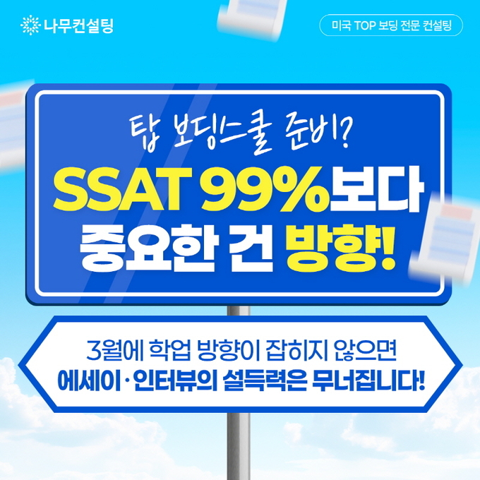 점수 경쟁이 아니라 ‘우리 학교에 왜 필요한 학생인가’를 보여주는 구조가 합격의 핵심이라는 것이다. 보딩스쿨 합격 기준에 맞춘 학업·활동 방향 점검과 전략 설계는 나무컨설팅 설명회 및 개별 상담을 통해 확인할 수 있다.