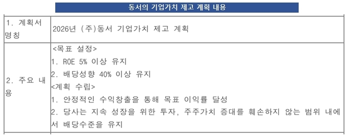 고배당 기업은 정기 주주총회에서 이익배당을 결의한 다음 날까지 기업가치 제고 계획을 작성해 공시해야 한다. 시기적으로 봤을 때 기업가치 제고 계획 공시를 준비하지 않았던 동서로서는 일자에 맞추기 위해 필수 요건만 시급하게 공시한 셈이다.