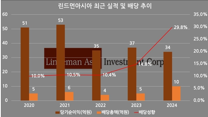 금융감독원 전자공시시스템에 따르면 린드먼아시아는 2024년 결산 기준 총 10억원을 배당했다. 주당 배당액은 79원이며 배당성향은 29.8%로 집계됐다.