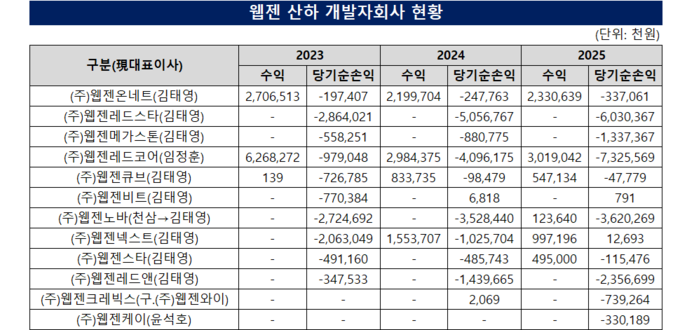 신규 RPG 프로젝트를 담당하는 개발 자회사들도 대부분 적자를 이어가고 있다. 웹젠노바는 최근 3년간 30억원 안팎의 손실을 지속했고, 웹젠레드앤 역시 2023년 약 3억원에서 2025년 약 23억원 수준으로 적자가 확대됐다. 웹젠메가스터와 웹젠스타 등 다른 개발 자회사들도 수억원 규모의 적자를 기록 중인 상황이다.