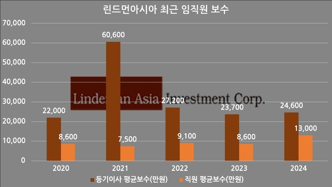 금융감독원 전자공시시스템에 따르면 린드먼아시아의 2024년 기준 등기이사 1인당 평균 보수액은 2억4600만원으로 집계됐다. 전년 대비 3.8% 증가한 수준이다.