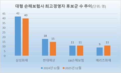 12일 각 보험사가 공시한 ‘2025년 지배구조 및 보수체계 연차보고서’를 종합하면 삼성화재, DB손해보험, 메리츠화재, 현대해상 등 4개 대형 손보사의 지난해 12월 말 CEO 후보군 수는 77명으로 전년 12월 말 80명에 비해 3명(3.8%) 감소했다.