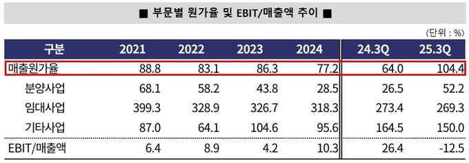 2024년에는 이러한 구조가 긍정적으로 작용했다. 고덕강일 공공주택지구 분양사업의 원가율이 개선되면서 EBIT(이자·세전이익) 대비 매출 비율이 전년 대비 6.1%포인트 상승한 10.3%를 기록하며 수익성이 크게 개선됐다.