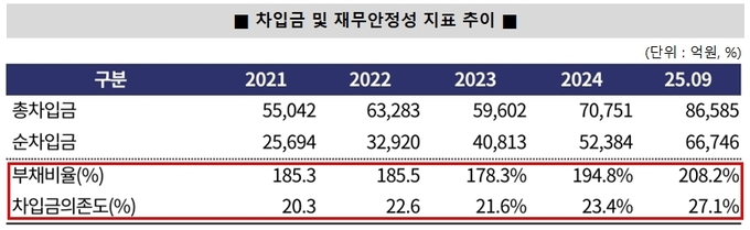 이에 따라 2025년 9월 말 기준 부채비율은 208.2%, 차입금의존도는 27.1%를 기록하며 공기업 수준의 재무안정성을 유지하고 있다. 투자 확대에 따른 차입 부담이 커지고 있지만 지자체 지원과 자본 확충을 통해 재무 안전판을 확보하고 있다는 평가다.
