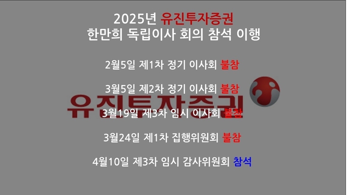 유진투자증권 관계자는 “만장일치 안건이 아닌 것들이 있어 개인적 사정으로 불참했다”며 “만장일치 안건이었다면 퇴임이사로 참여했을 것”이라고 설명했다.