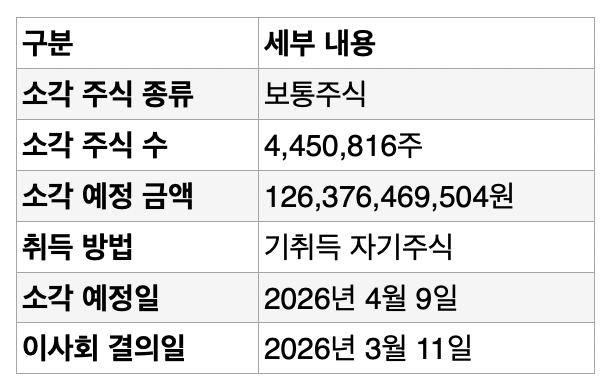 또한, 자본금 감소 없이 배당가능이익 범위 내에서 이루어진다. 소각 대상 주식은 지난 2024년 분할, 합병 과정에서 취득한 자사주다.