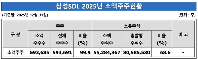 최근 삼성SDI 사업보고서에 따르면 지난해 말 소액주주는 59만3685명에 달하는 것으로 집계됐다. 전년(39만852명) 동기 대비 약 52% 증가했다. 총 발행주식 중 소액주주가 차지하는 비율도 68.6%로 전년(61.72%) 동기 대비 상승했다. 소액 주주기반이 확대된 가운데 삼성SDI는 주주환원책엔 신중한 모습이다. 오는 2027년까지 현금 배당을 실시하지 않을 방침이며 아직 자사주 소각·처분 계획은 없다는 입장이다.