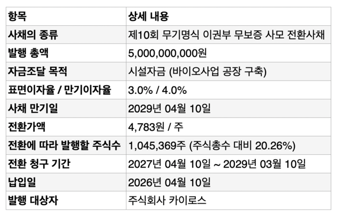 주요 발행 조건을 살펴보면 표면이자율은 3%, 만기이자율은 4%로 책정됐다. 사채 만기일은 2029년 4월 10일이다. 전환가액은 주당 4783원으로 향후 주식으로 전환될 경우 신주는 총 104만5369주가 발행된다. 이는 현재 발행주식 총수 대비 20.26%에 해당하는 물량이며 전환 청구 기간은 2027년 4월 10일부터 2029년 3월 10일까지다.