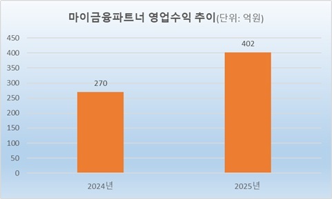 마이금융파트너의 연간 영업수익이 400억원을 넘어선 것은 지난해가 처음으로, 사상 최대 규모다.