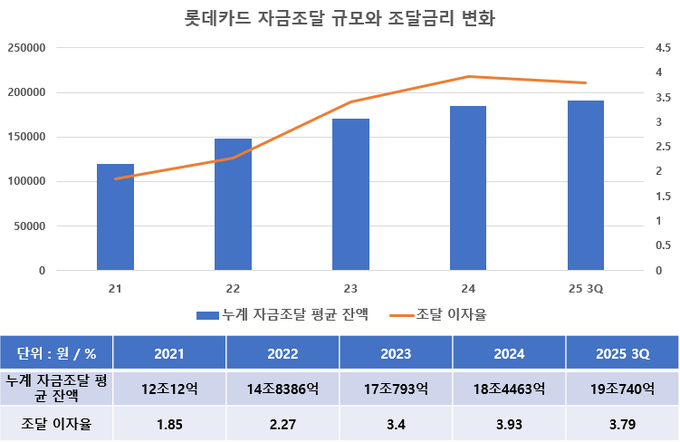 롯데카드는 회사채 발행과 일반 차입 등을 통해 자금을 조달하고 있다. 2025년 3분기 누계 기준 자금 조달 평균잔액은 19조740억원이며 조달 이자율은 3.79%다. 2024년 3분기 대비 조달 이자율은 0.14%p 개선됐다. 저금리 차환과 조달 다변화 전략이 영향을 미친 것으로 분석된다.