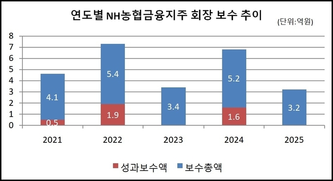 농협금융 관계자는 “공시되는 보수 기준이 회장 재직 기준이기 때문에 2024년도 보수는 이석준 전 회장이 수령한 금액”이라며 “2025년도는 이찬우 회장이 수령한 금액이 공시된 것인데 이찬우 회장은 2025년 2월에 부임해 성과보수가 없고, 1개월치가 빠져 2024년도 보다 적게 수령한 것처럼 자칫 보일 순 있으나 큰 차이는 없다”고 설명했다.