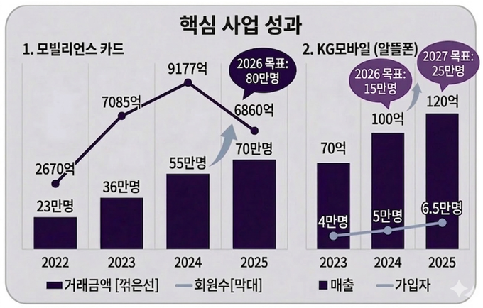 알뜰폰 사업인 KG모바일도 외형을 키우고 있다. KG모빌리언스는 2022년 12월 알뜰폰 시장에 진출한 이후 가입자를 꾸준히 늘리며 사업 기반을 확대해 왔다. 가입자는 2023년 4만명에서 2025년 6만5000명으로 늘었고 같은 기간 매출도 70억원에서 120억원으로 증가했다. KG모빌리언스는 향후 알뜰폰 가입자를 2026년 15만명, 2027년 15만명까지 확대한다는 목표다.