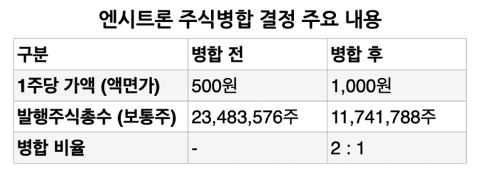 17일 금융감독원 전자공시에 따르면 엔시트론은 액면가 500원인 보통주를 1000원으로 병합한다. 이에 발행주식 총수는 기존 2348만3576주에서 1174만1788주로 줄어들게 된다. 이번 주식병합은 기업가치는 유지되면서 주식 수만 조정되는 방식이며 자본금이 감소하는 감자와는 구분된다.